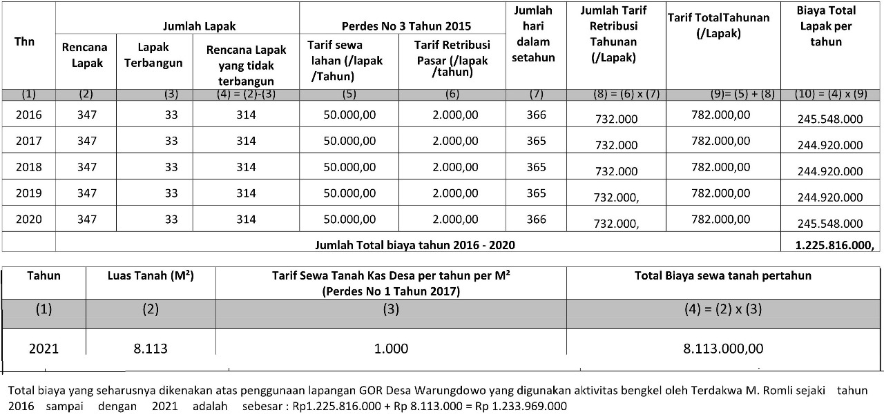 Kepada Majelis Hakim, Auditor Inspektorat Kabupaten Pasuruan ini mejelaskan bahwa dasar penghitungan yang dilakukannya adalah Rencana pembangunan lapak dikurangi dengan lapak yang sudah terbangun dan retribusi yang akan dikenakan terhadap rencana pembangunan lapak berdasarkan Peraturan Desa Nomor 3 tahun 2015
