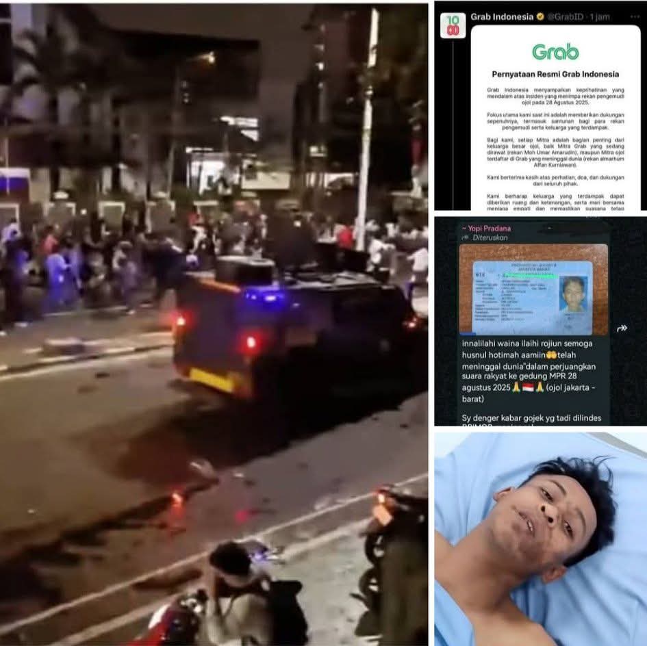 OJOL TERLINDAS – Driver ojol Affan terlindas kendaraan taktis (Rantis) Brimob yang sedang menghalau para pendemo di Jalan Pejompongan, Tanah Abang, Jakarta Pusat, Kamis (28/8/2025) malam
