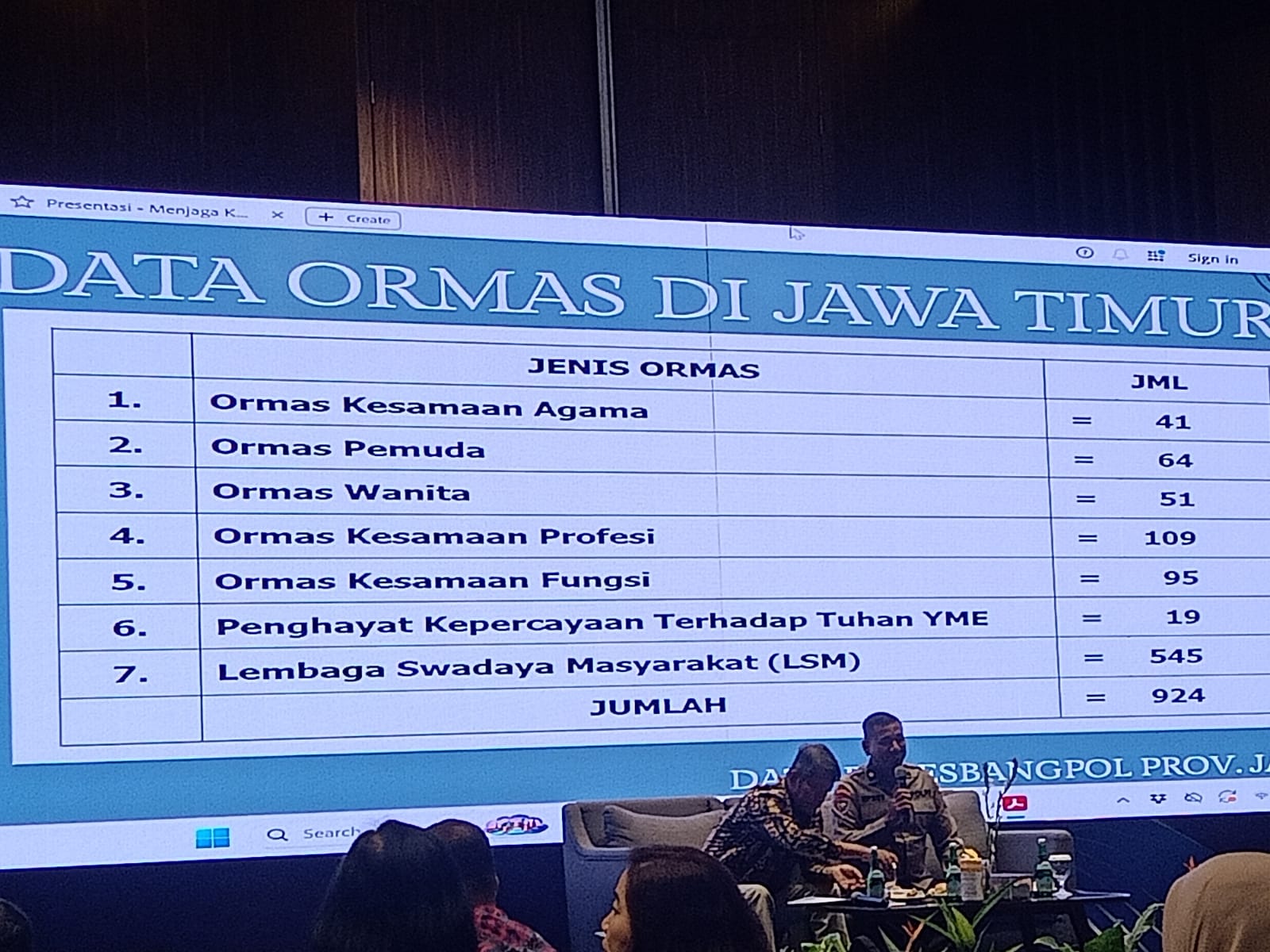 Mewakili Kesbangpol Provinsi Jawa Timur, Kepala Bidang Ketahanan Ekonomi, Sosial, Budaya, Agama, dan Ormas, Agus Imantoro, SE, S.Sos, M.M menyampaikan, bahwa hingga saat ini telah tercatat 1.383 Organisasi Kemasyarakatan yang telah terdaftar secara resmi di Badan Kesbangpol Provinsi Jawa Timur. Menurutnya, jumlah tersebut mencerminkan Dinamika Masyarakat Sipil yang Aktif dan Beragam, sehingga membutuhkan Ruang Komunikasi yang Sehat dan Berkesinambungan.