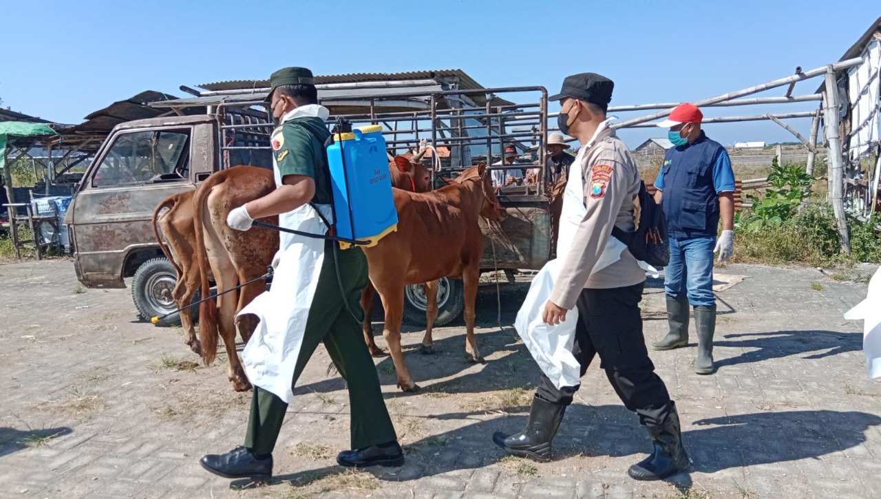 Selain melakukan pendampingan kepada petugas kesehatan hewan, personil TNI-POLRI dari Polsek Sampang dan Koramil Sampang 0828/01 melaksanakan penyemprotan disenfektan kepada kendaraan angkutan hewan guna meminimalisir PMK.