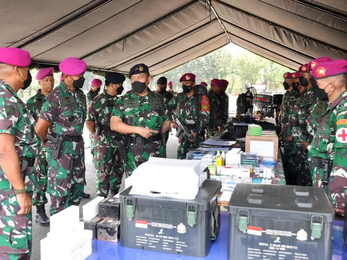 Sidoarjo, paradigmanasional.id Komandan Pasmar 2 Brigjen TNI (Mar) Suherlan mendampingi Asisten Operasi (Asops) Kasal Laksamana Muda TNI Dadi Hartanto melaksanakan pemeriksaan kesiapan operasi Satuan Tugas Marinir (Satgasmar) Ambalat XXVIII dan Satuan Tugas Marinir (Satgasmar) Pulau Terluar XXVI wilayah timur dan wilayah barat, dilapangan apel Mako Brigif 2 Marinir Kesatrian Marinir R.Suhadi Gedangan, Sidoarjo. Selasa (31/05/2022).