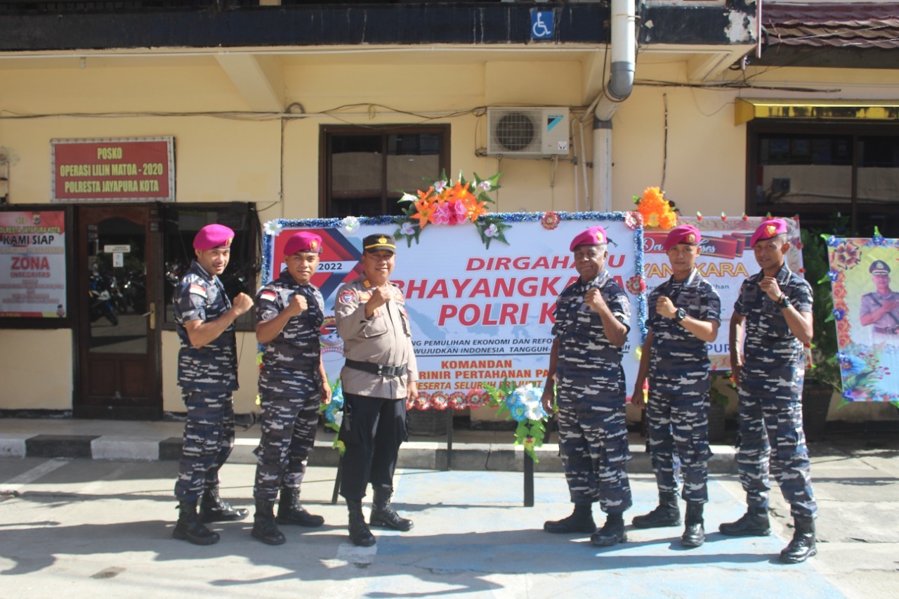 Di tempat yang berbeda, Dankima Yonmarhanlan X Jayapura Kapten Marinir F.H Simbiak mewakili Danyonmarhanlan X Jayapura memberikan ucapan serta karangan bunga dalam rangka memperingati HUT Ke-76 Bhayangkara kepada Kapolresta Jayapura yang diterima oleh AKP Erwin Queen selaku Wakasat Binmas Polresta Jayapura Kota. Dirinya sangat mengapresiasi dan mengucapkan terima kasih atas surprise yang diberikan pada HUT Ke-76 Bhayangkara. Beliau juga berharap agar sinergitas yang sudah terjalin selama ini supaya tetap dijaga dan dipelihara dengan baik.