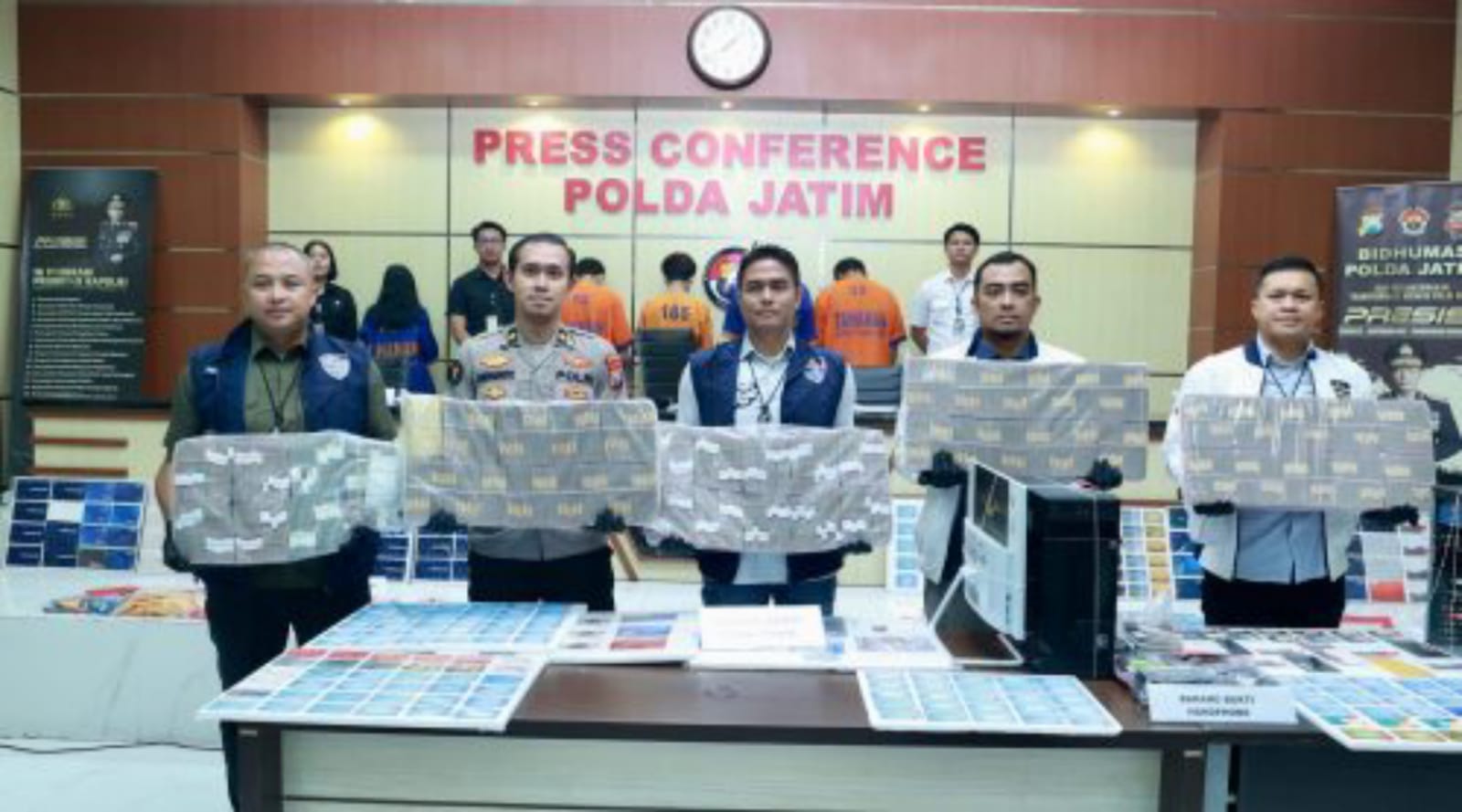 Sedangkan Barang bukti yang telah diamankan, yaitu Uang Tunai sejumlah Rp.4.957.174.000, 1 (Satu) Unit PC All In One Warna Putih, 3 (Tiga) Unit CPU Warna Hitam, 49 Unit Handphone, 375 Buah Kartu ATM juga beserta Buku Tabungan, 185 Buah Key Token Bank, 3 (Tiga) Buah Buku Akta Pendirian PT dan 1 (Satu) Bundel Slip Transfer.