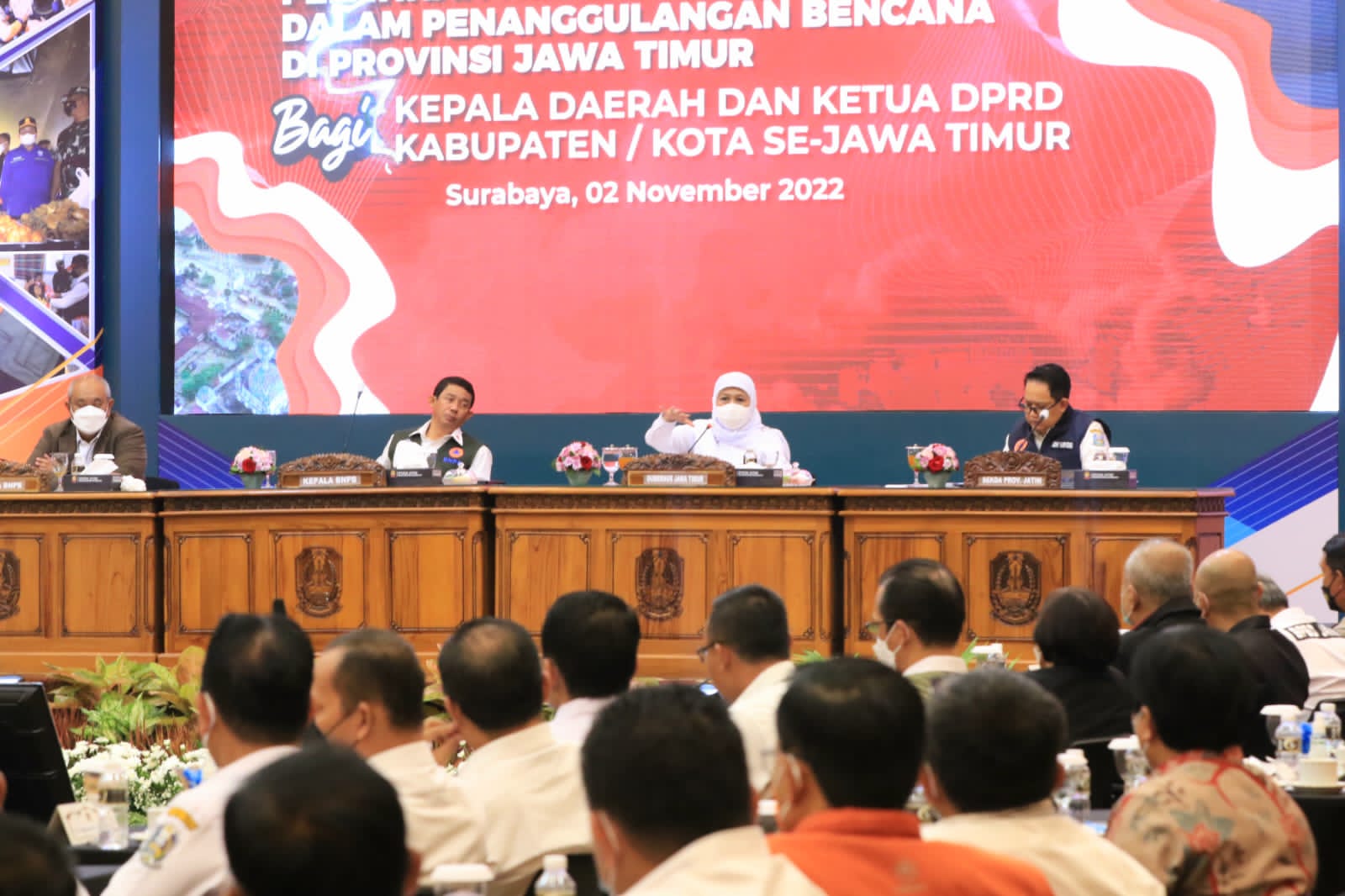 Hal itu menjadi pesan Gubernur Khofifah saat menghadiri Pelatihan Kepemimpinan dalam Penanggulangan Bencana Provinsi Jatim yang dihadiri para Kepala Daerah dan Pimpinan DPRD se Jawa Timur, serta dipimpin langsung oleh Kepala BNPB RI Letjen TNI Suharyanto, di BPSDM Provinsi Jatim Jalan Balongsari Tama Surabaya, Rabu (2/11/2022).