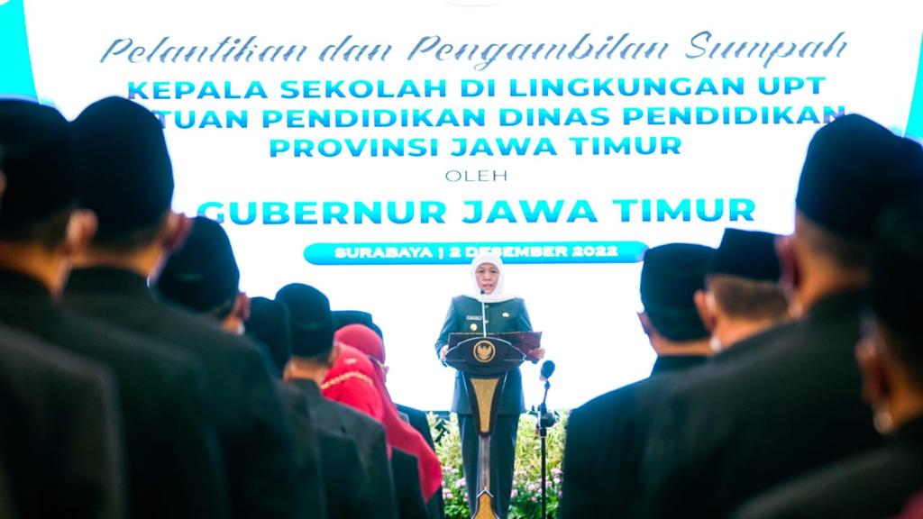 Jawa Timur, paradigmanasional.id – Gubernur Jawa Timur Khofifah Indar Parawansa melantik 306 Kepala Sekolah SMA, SMK dan SLB di Lingkungan Unit Pelaksana Teknis (UPT) Satuan Pendidikan Dinas Pendidikan Provinsi Jawa Timur, Jumat (2/12/2022).