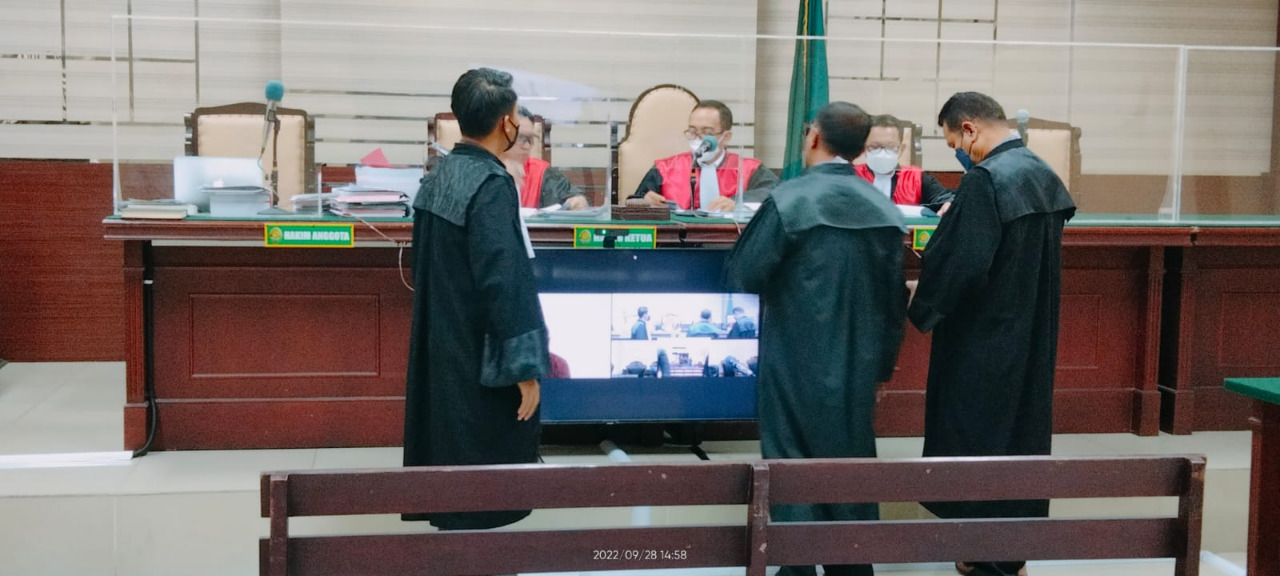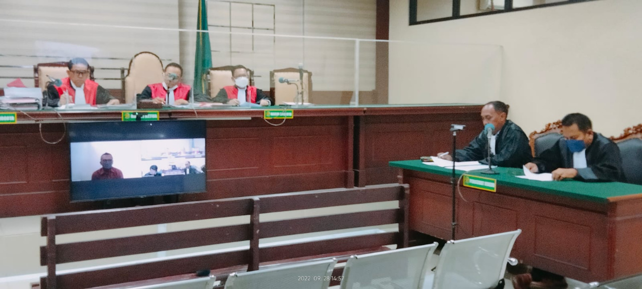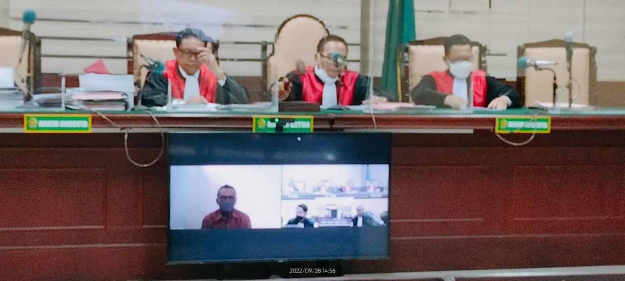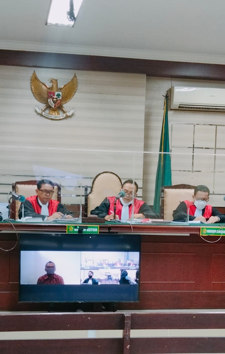 Sementara persidangan yang berlangsung secara Virtual (Zoom) diruang sidang Candra Pengadilan Tipikor pada PN Suarabaya, Rabu, 28 September 2022 adalah pembacaan surat dakwaan oleh Tim JPU R. Harwiadi, SH., MH., Li dkk terhadap Terdakwa Ferri Jacom dengan didampingi Tim Penasehat Hukum-nya, Iwan Harimurti dan Abd. Saleh dihadapan Majelis Hakim yang diketuai Hakim A.A. Gd Agung Parnata, SH., CN dengan dibantu 2 Hakim Ad Hoc masing-masing sebagai anggota yaitu Fiktor Panjaitan, SH., MH dan Alex Cahyono, SH., MH serta Panitra Pengganti (PP) Achmad Fajarisman, S.Kom., SH., MH dan dihadiri pula oleh Terdakwa secara Teleconference (Zoom) dari Rutan (rumah tahanan negera) Kejaksaan Tinggi Jatinggi – Jawa Timur Cabang Surabaya