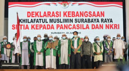Forkopimda Jatim, Pangdam V Brawijaya Mayjend TNI Nurchahyanto, Kapolda Jatim Irjen Pol Nico Afinta, Kabinda Jatim Marsma TNI Rudy Iskandar, Asisten 1 Setdaprov Jatim Benny Sampirwanto yang mewakili Gubernur Jatim, Forkopimda Kota Surabaya, Pengurus Wilayah Nahdlatul Ulama (PWNU) Jatim, Pimpinan Wilayah Muhammadiyah Jatim, Forum Kerukunan Umat Beragama (FKUB) Jatim, Tokoh Agama dan Tokoh Masyarakat, Kamis (30/6/2022) di Gedung Balai Pemuda Surabaya, menyaksikan organisasi Khilafatul Muslimin sebanyak 52 orang melakukan Deklarasi Kebangsaan, Khilafatul Muslimin Surabaya Raya Setia Kepada Pancasila dan NKRI.
