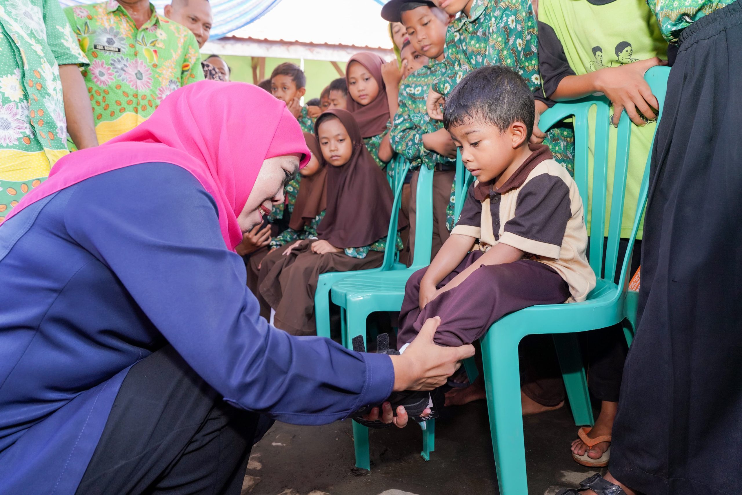 Saya juga membantu mengenakan sepatu baru secara simbolik kepada beberapa siswa secara langsung, sebuah aksi sederhana yang penuh makna dan menunjukkan kedekatan kita dengan masyarakat.