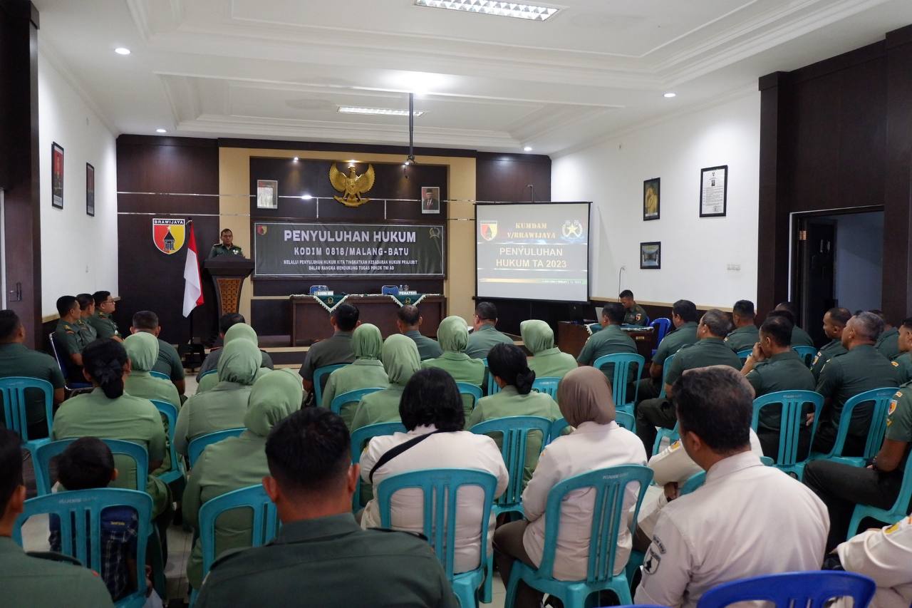Malang, paradigmanasional.id – Personel Kodim 0818 Malang – Batu menerima penyuluhan Hukum Triwulan II TA 2023 bagi prajurit, PNS serta Persit KCK Cabang XXXII Dim 0818 dari tim Kumdam V/Brawijaya, Rabu (12/07).Kegiatan berlangsung di Aula Makodim 0818 dengan mengusung tema ”Melalui penyuluhan hukum kita tingkatkan kesadaran hukum prajurit dalam rangka mendukung tugas pokok TNI-AD”.