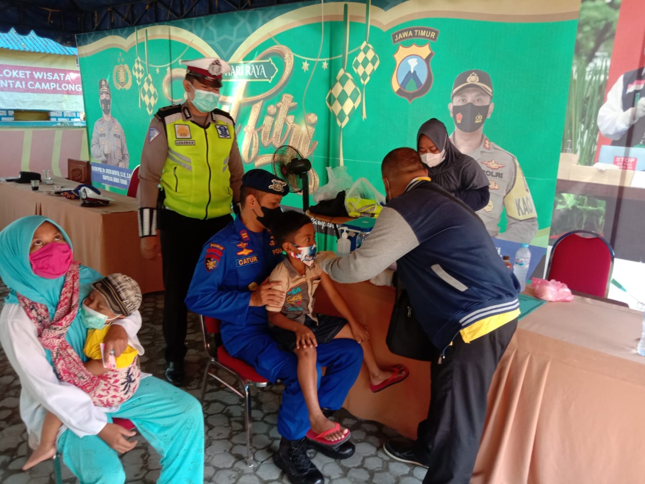 Di luar lokasi pantai petugas membagikan masker-masker kesehatan kepada pengunjung sekaligus menyampaikan himbauan kepatuhan protokol kesehatan sekaligus edukasi pentingnya vaksinasi Covid-19 dalam percepatan penanganan Pandemi Covid-19.