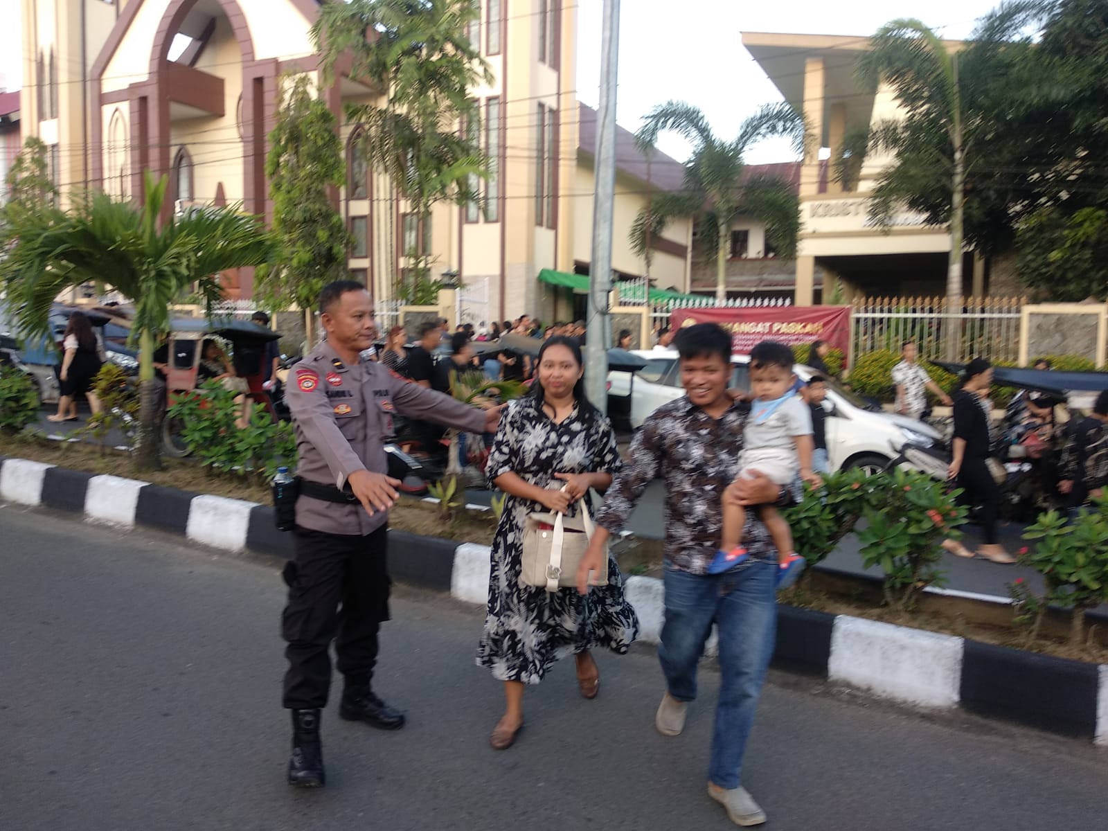 “Petugas juga membantu penyeberangan jemaat, sekaligus mengarahkan kendaraan agar tidak menimbulkan kemacetan di jalur utama,” tambah IPDA Sandri.