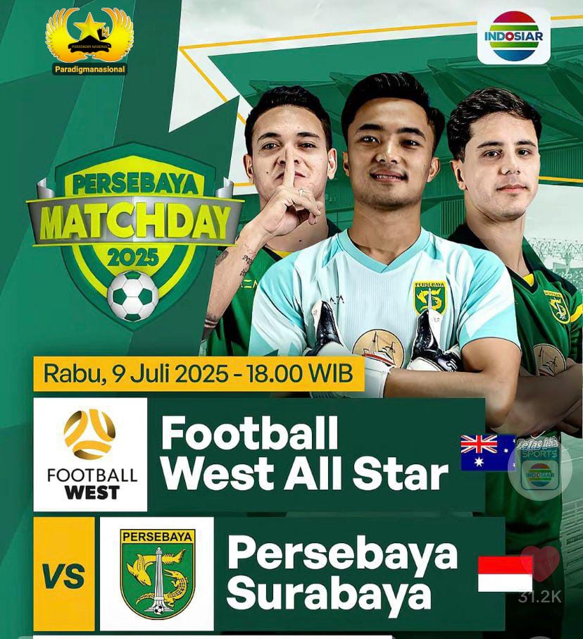 Jadwal siaran langsung pertandingan pra musim Persebaya, melawan Football West All Star, Australia dapat disaksikan di Indosiar dan Video pada Rabu (9/7/2025).