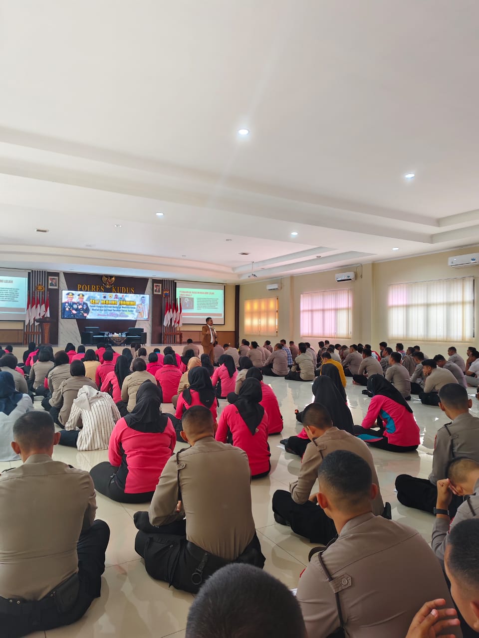 Kegiatan digelar di Aula Parama Satwika Mapolres Kudus yang menghadirkan narasumber, yakni Dr. Ketut Abid Halimi, S.Pd.I, M.Pd, C.Ht, C.Ps yang selaku Direktur Thanks Institute Indonesia, adalah Putra Bali.