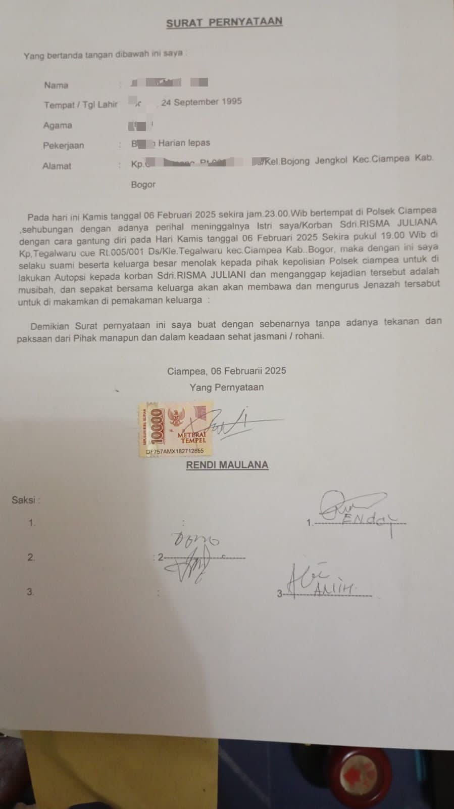 – Keluarga korban menolak untuk di lakukan autopsi dan akan membawa, dan menganggap korban meninggal adalah musibah dan suratan takdir yang maha kuasa. (Surat pernyataan terlampir).