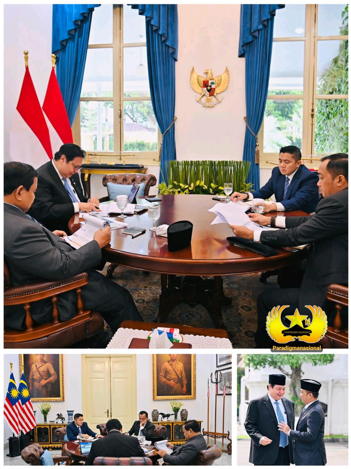 Jakarta, paradigmanasional.id —  Jumat, 27 Juni 2025. Seusai menerima kedatangan Perdana Menteri Malaysia, Yang Mulia Anwar Ibrahim, Presiden Prabowo Subianto mengadakan rapat terbatas bersama sejumlah menteri Kabinet Merah Putih di Istana Merdeka, pada Jumat, 27 Juni 2025, membahas sejumlah isu, di antaranya respons dan strategi ekonomi nasional terhadap tantangan global saat ini, termasuk perkembangan perundingan tarif dengan Amerika serikat, hingga revitalisasi kerja sama di kawasan Asia Tenggara. Turut hadir dalam ratas ini adalah Menko Perekonomian Indonesia, Bapak Airlangga Hartarto, dan Menteri Sekretaris Negara, Bapak Prasetyo Hadi.