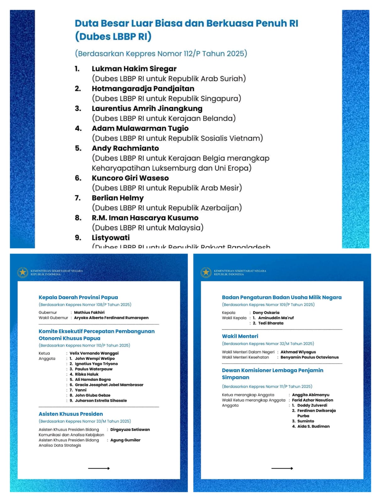 Presiden juga melantik Badan Pengaturan Badan Usaha Milik Negara, Dewan Komisioner Lembaga Penjamin Simpanan, serta Komite Eksekutif Percepatan Pembangunan Otonomi Khusus Papua. (Korlipn).