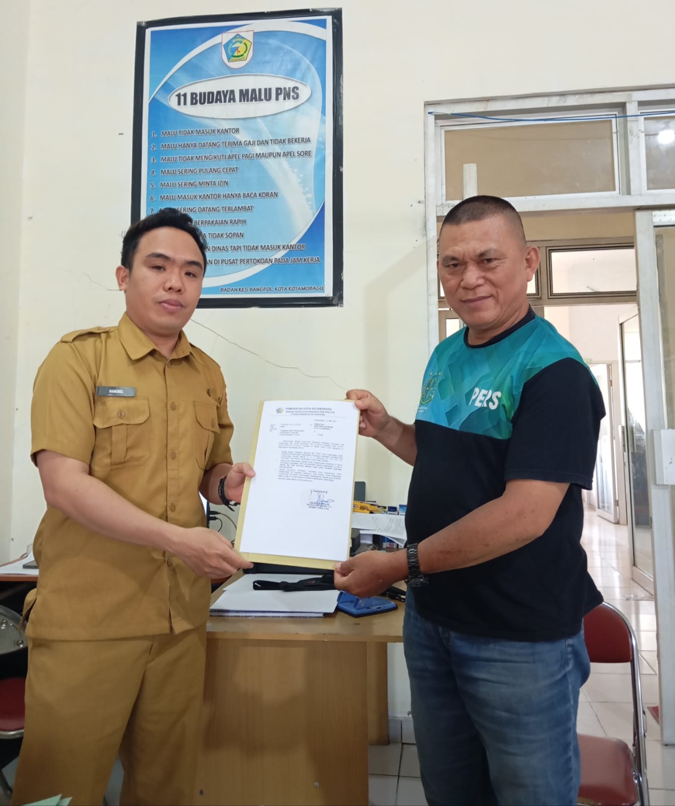 Surat legalitas tersebut diserahkan oleh staf Kesbangpol Marchel Tulende di ruang kerja kepada Wakil Ketua PWI Kota Kotamobagu bidang Pendidikan dan pelatihan Feki Sajow, SE, S.Th.