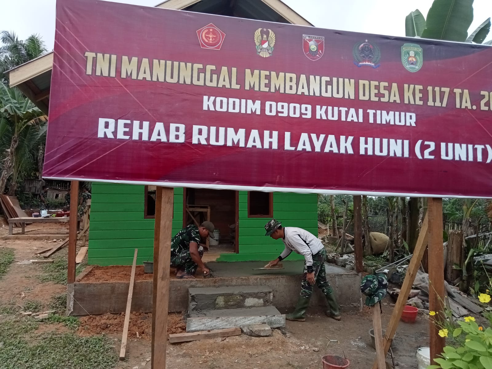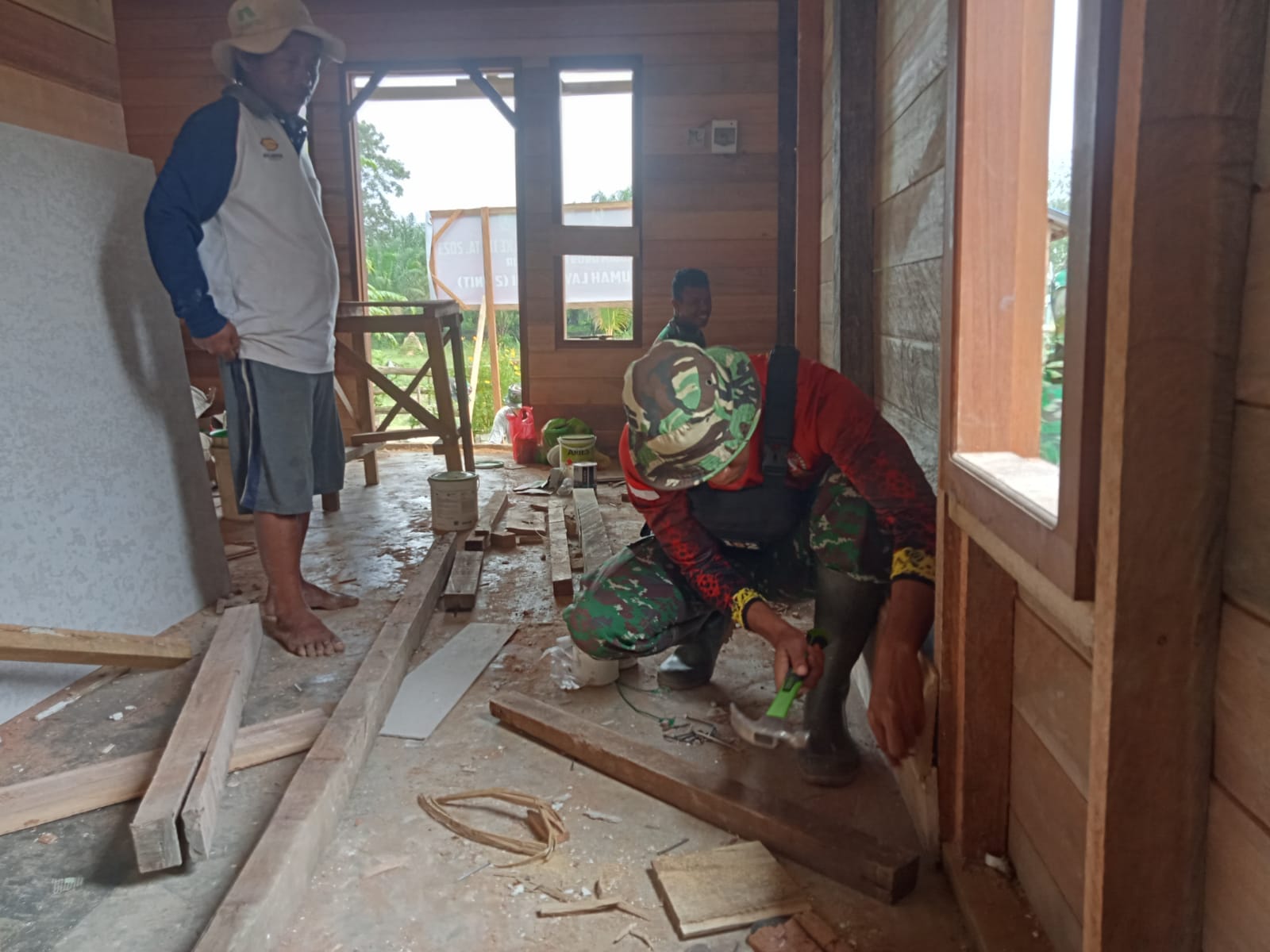 Untuk renovasi rumah tidak layak huni milik warga atas nama bapak Sopingi Desa Suka Maju oleh Satgas TMMD 117 Kodim 0909/Kutai Timur hari ini memasuki tahap pemasangan panel dalam ruang dan pemasangan tangga rumah.