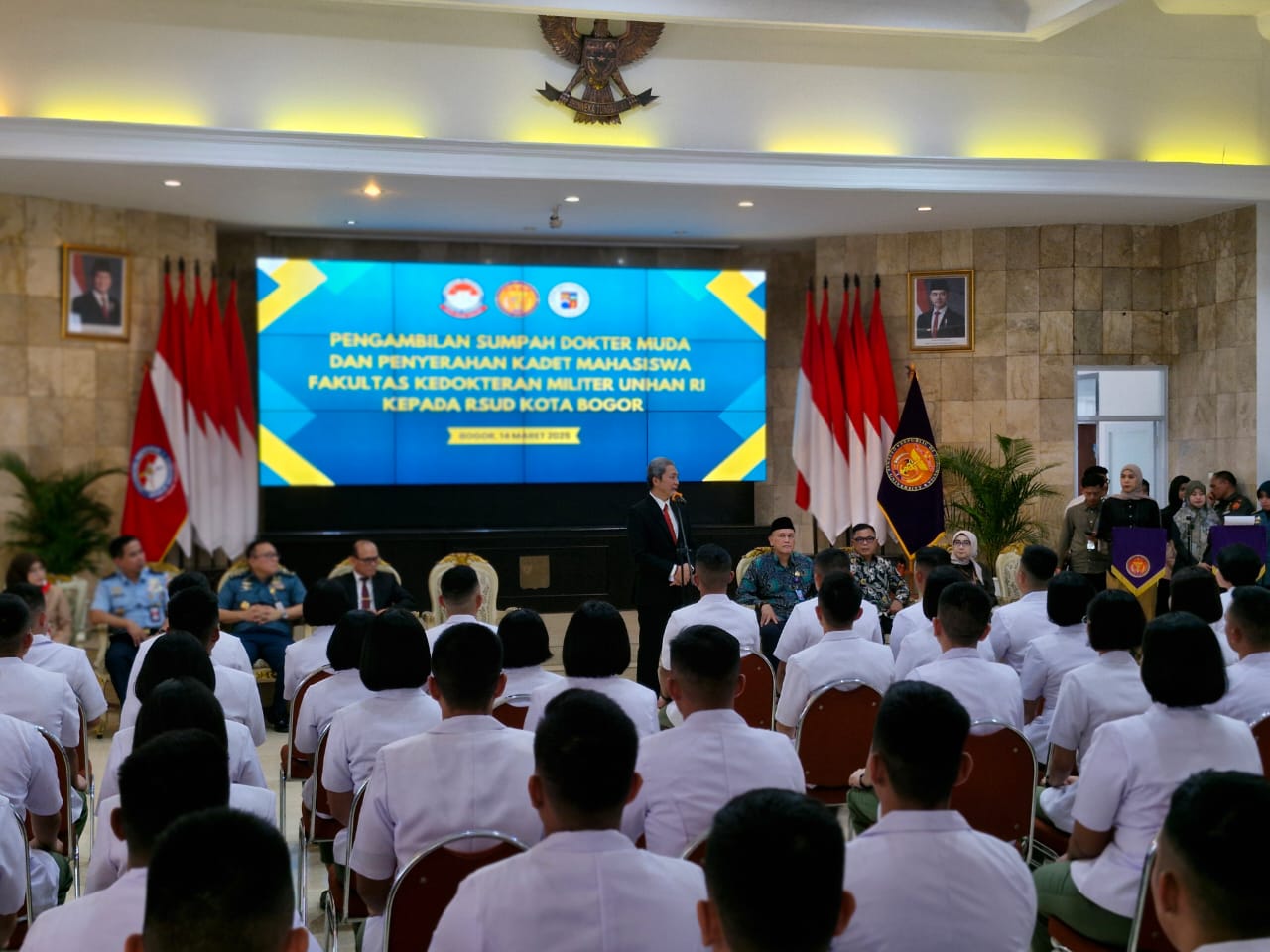 Kota bogor, Paradigmanasional.id 75 dokter muda atau sarjana kedokteran militer dari Universitas Pertahanan Republik Indonesia (Unhan RI) resmi mengucapkan sumpah dokter dalam acara yang digelar pada Jumat (14/3/2025) di Ruangan Pasabean Surawisesa, Setda Kota Bogor. Acara ini dipimpin langsung oleh Rektor Unhan RI, Letnan Jenderal TNI (Purn.) Jonni Mahroza. Pengambilan sumpah ini menandai transisi para dokter muda dari fase pembelajaran teoritis ke praktis, sekaligus menjadi langkah awal mereka untuk berkontribusi kepada masyarakat di Rumah Sakit Umum Daerah (RSUD) Kota Bogor.