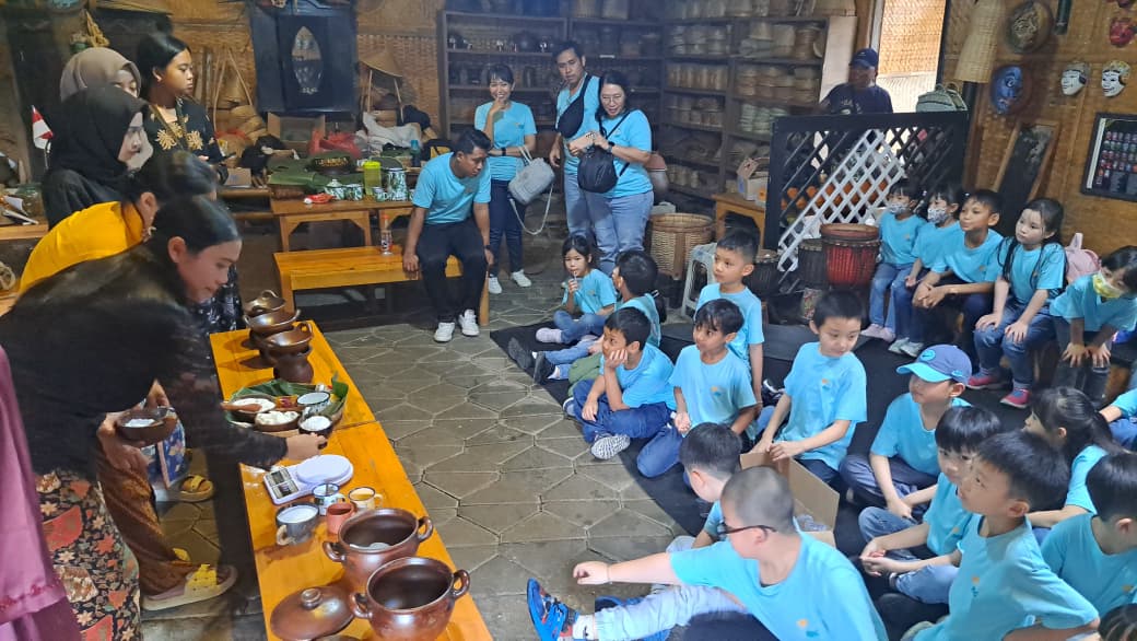 Tak kalah seru, sesi selanjutnya membawa anak-anak ke dapur tradisional (pawon) untuk belajar membuat kue serabi bersama Bu Siti Juwariyah dan Reni Ismiati. Seperti tradisi di KBP, tamu juga disuguhi aneka jajanan pasar khas, mulai dari polopendem (ubi, ketela, gembili), hingga lopis, klepon, dan dawet yang dihidangkan dalam wadah tradisional besek. Anak-anak terlihat senang saat bisa mencoba membuat serabi satu per satu, bahkan tak ketinggalan minta dibungkus untuk oleh-oleh.
