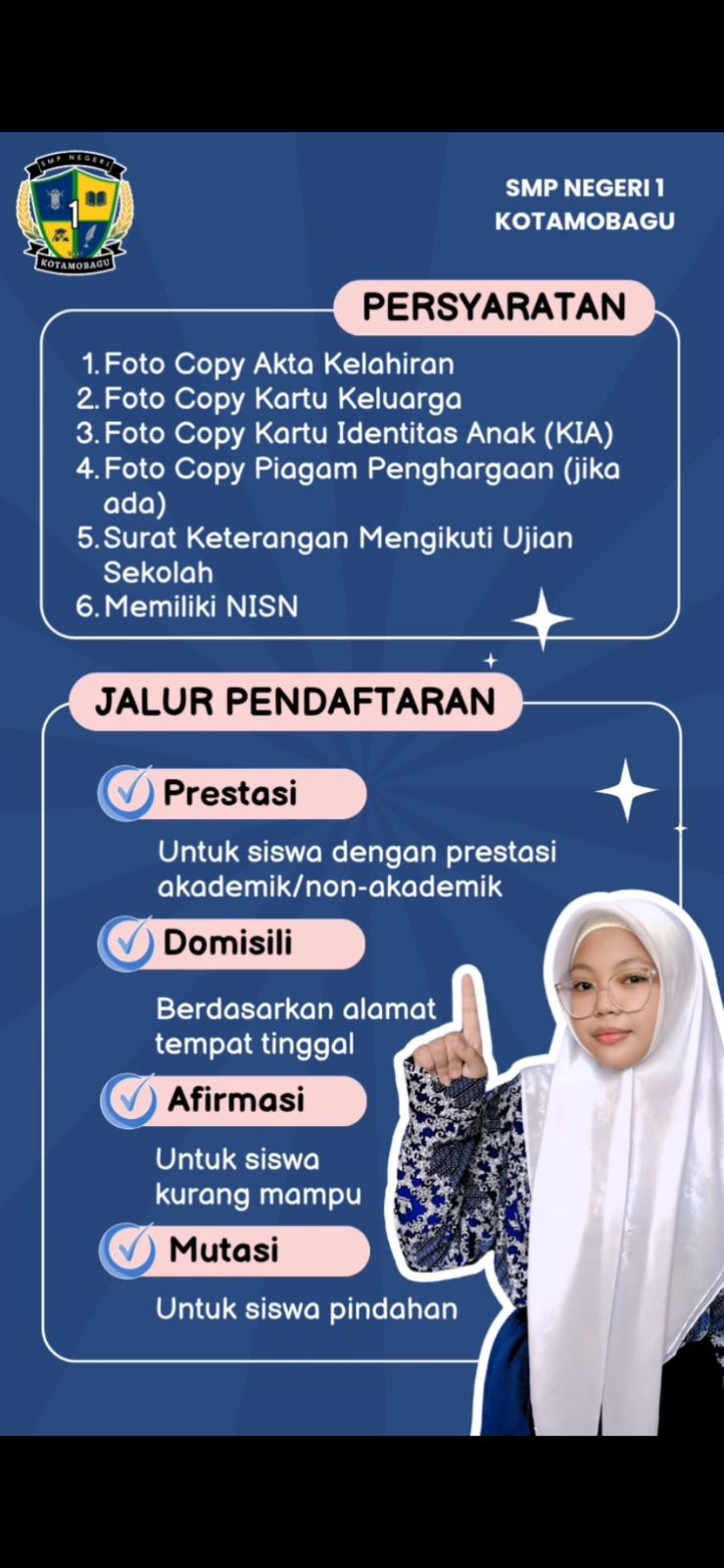 Sistem Pendaftarannya akan mencakup empat jalur, yaitu jalur AFIRMASI, jalur PRESTASI, DOMISILI, dan jalur MUTASI. SMPN 1 kotamobagu adalah salah satu sekolah unggulan, yang memiliki beragam prestasi di bidang akademik maupun non akademik.